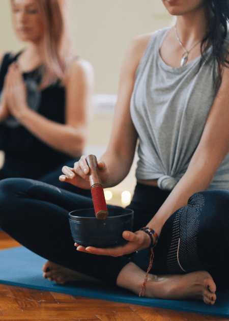 tapis de Yoga – blocs – bolsters – sangles – balles de tennis – coussins – ballons mous – plaids – hamacs de Yoga aérien – diffuseur d’huiles essentielles – chaîne Hi-Fi bluetooth – photophores avec bougies – petits instruments type carillon Koshi & mini xylophone…